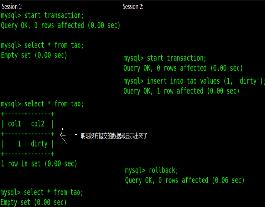 “脏读”的意思是在一个会话 Session1 中开启一个事务,在事务中插入一条数据,但是没有提交事物,此时在另一个会话 Session2 中开启一个事务,会查询到这条数据,这种现象称之为“脏读”,下图为实际操作演示: