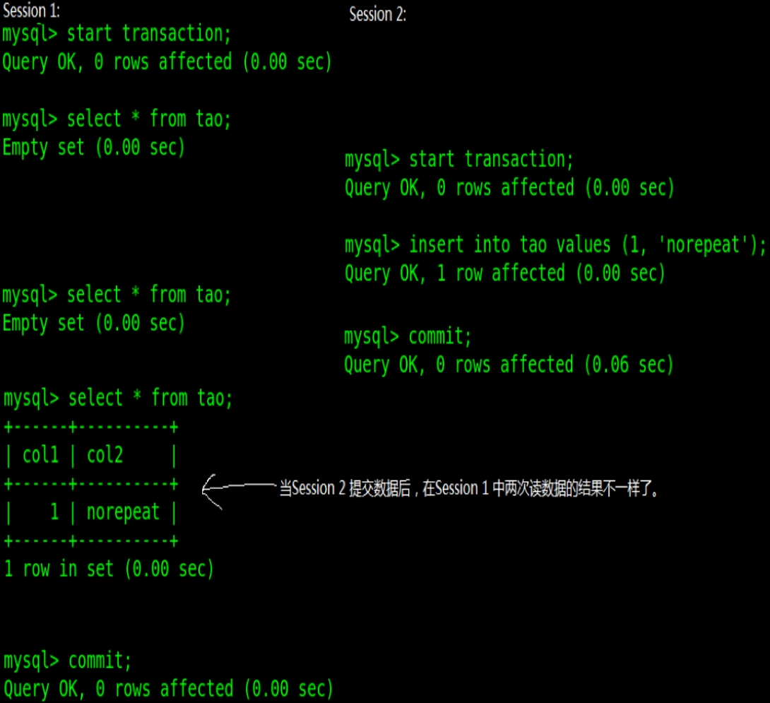 “不可重复读”的意思是在一个会话 Session1 中开启一个事务,查询数据库未查到数据,此时在另一个会话 Session2 中开启一个事务,插入一条数据并提交,此时回到 Session1 查询数据库会查到这条数据,这种现象称之为“不可重复读”,下图为实际操作演示: