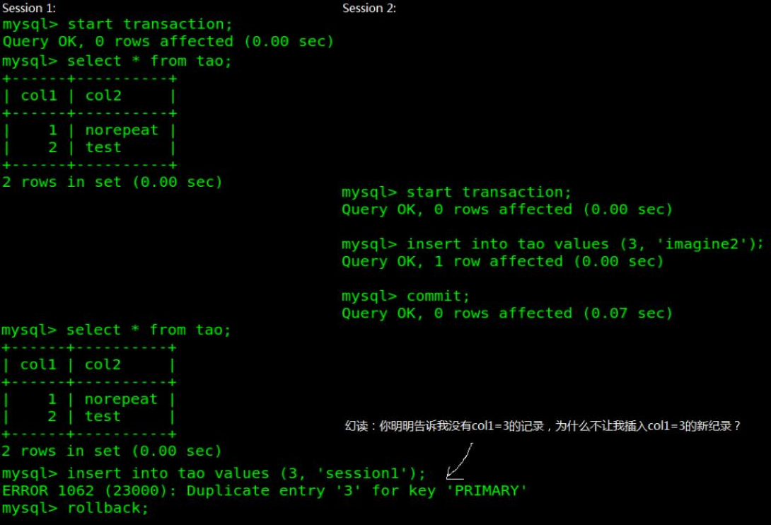 “幻读”的意思是在一个会话 Session1 中开启一个事务,查询数据库未查到数据,此时在另一个会话 Session2 中开启一个事务,插入一条数据并提交,此时回到 Session1 查询数据库依然查不到数据,现在在 Session1 插入一条同样的数据,会提示错误,这种现象称之为“幻读”,下图为实际操作演示: